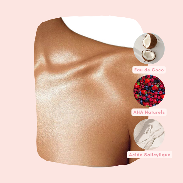 Les AHA et l’acide salicylique aident à affiner le grain de peau et à améliorer l’uniformité du teint du corps.